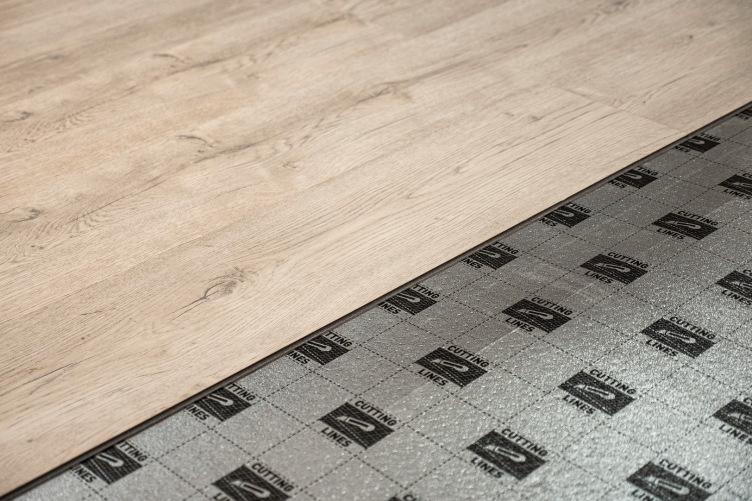 - Укладывайте напольное покрытие перпендикулярно полосам подложки. Следуйте инструкции по монтажу производителя Вашего напольного покрытия.